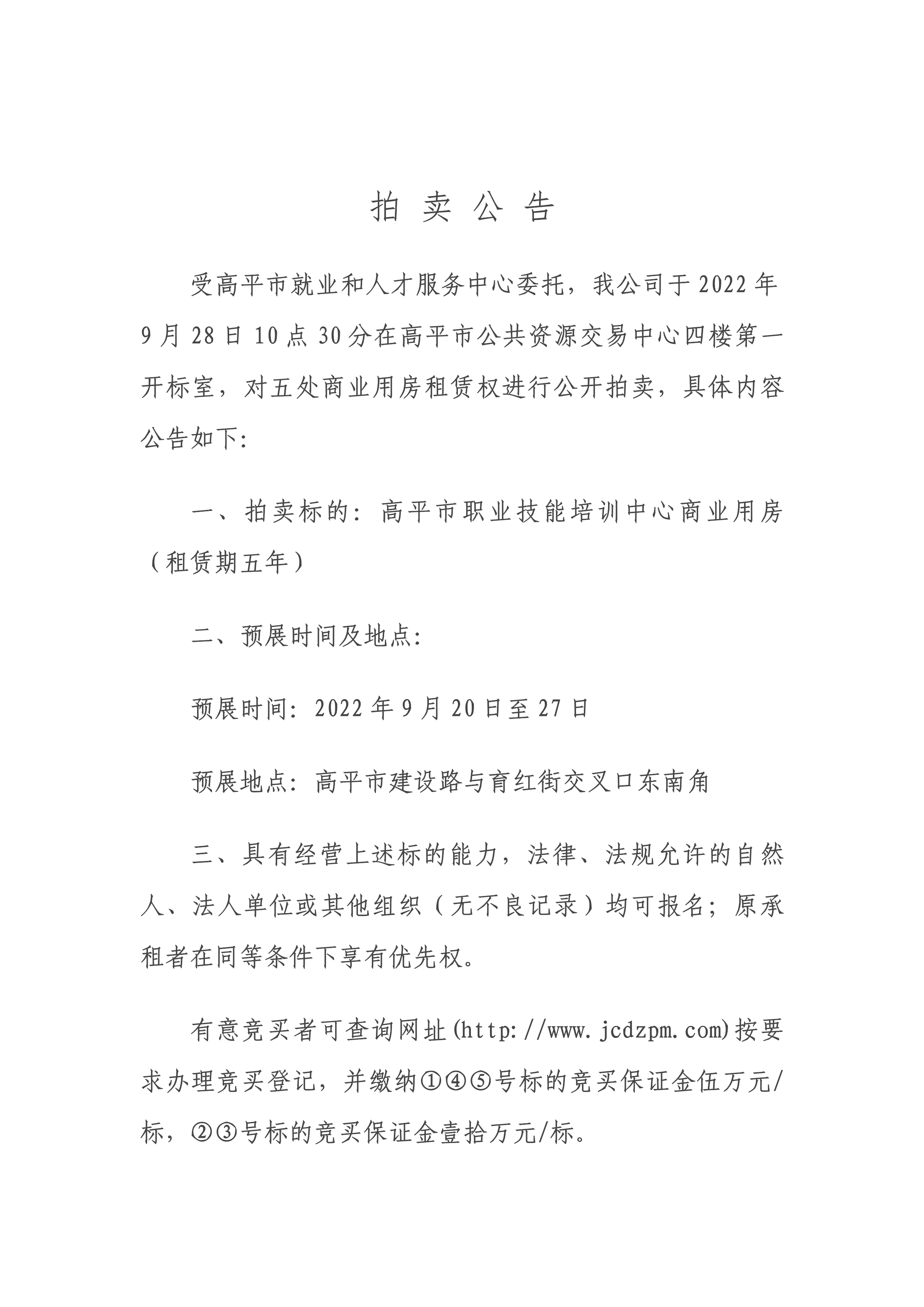 【拍賣公告】高平市職業(yè)技能培訓(xùn)中心商業(yè)用房租賃權(quán)公開拍賣